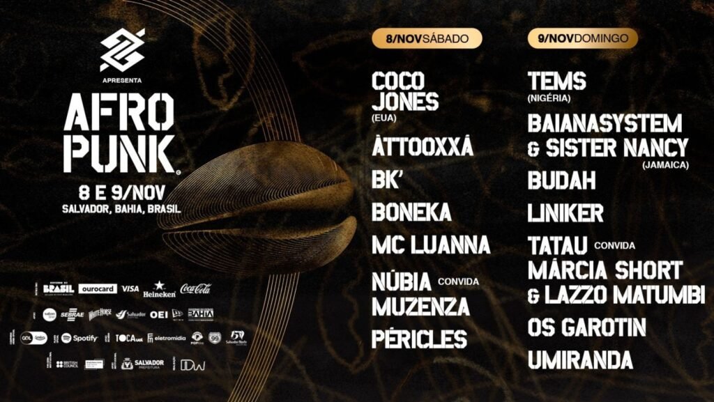 O AFROPUNK 2025 chega para mais uma edição histórica em Salvador! Nos dias 8 e 9 de novembro, a cidade se transforma no epicentro da cultura negra, com shows inesquecíveis, encontros únicos e a vibração da nossa roda.