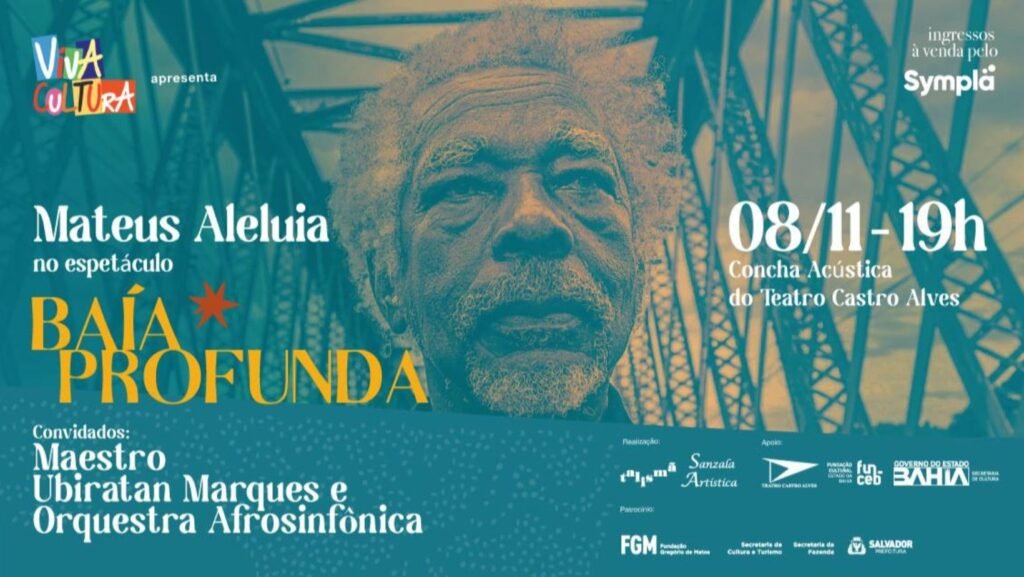 Dia 08 de novembro às 19h na Concha Acústica do Teatro Castro Castro, Mateus Aleluia e a Orquestra Afrosinfônica apresentam um show especial de lançamento do Projeto BAÍA PROFUNDA, com ingressos a preços acessíveis e ingresso solidário + 01kg de alimento, que serão doados ao Instituto Mãos Amigas. O repertório será composto de obras já conhecidas do público e criações mais recentes do próprio Mateus.