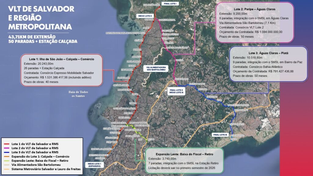 Com aproximadamente 43,71 quilômetros de extensão, com 50 paradas, além da Estação Calçada, o VLT teve suas obras autorizadas em junho de 2024, que estão sendo realizadas em três trechos. O sistema será integrado física e operacionalmente a outros modais de transporte da cidade, incluindo o Sistema Metroviário Salvador e Lauro de Freitas (SMSL), em dois pontos estratégicos: Águas Claras e Bairro da Paz.