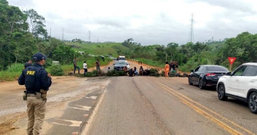 Agentes da Polícia Rodoviária Federal (PRF) acompanham a manifestação, mas os moradores ainda não informaram quando pretendem liberar a via.